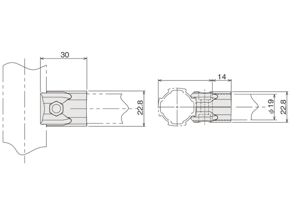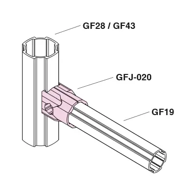 Connector perpendicularly connecting GF-S profile (19 mm) and GF-N profile (28 mm)/GF-G profile (43 mm)