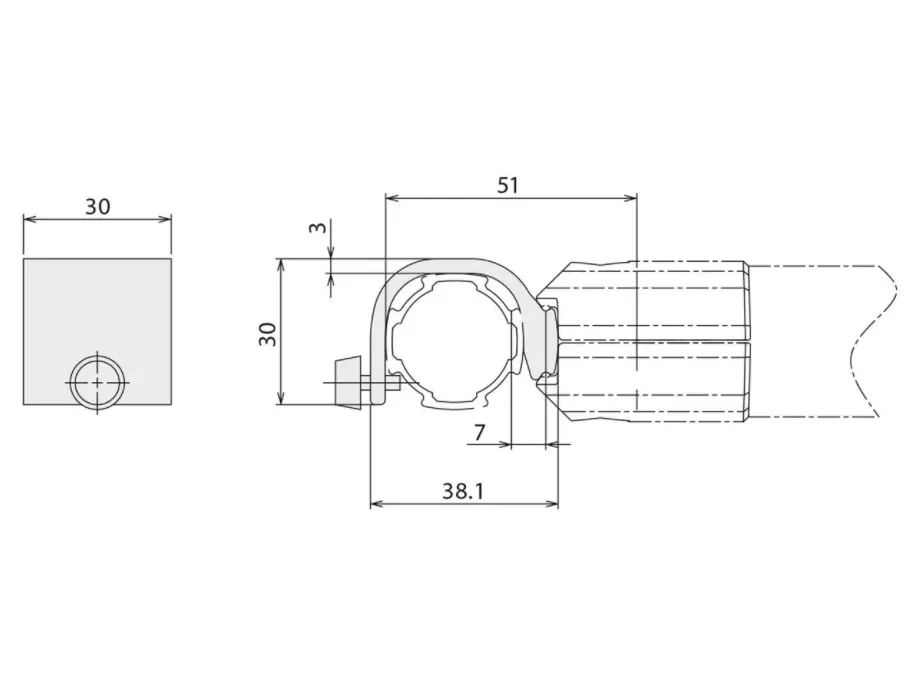 The connector is a component made of aluminum, specifically designed to facilitate the perpendicular connection of profiles. This device uses a mechanical locking system using a knurled screw, ensuring a strong and stable hold of the assembled structures. The configuration of the connector allows for quick and precise installation