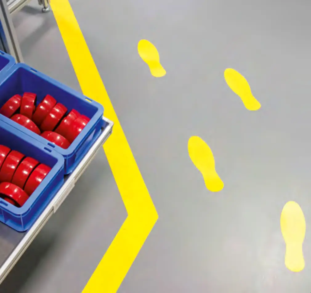 Sistema per la delimitazione a pavimento. Prodotti in PVC altamente resistente alle abrasioni, ai passaggi dei muletti ed ai lavaggi, sono di pratico utilizzo in quanto vengono forniti in rotolo da 50 metri in distributore di cartone e non richiedono tracciafilo per la posa. Ad alta e lunga tenuta non danneggiano la pavimentazione. Disponibili versione con simbologia ESD.