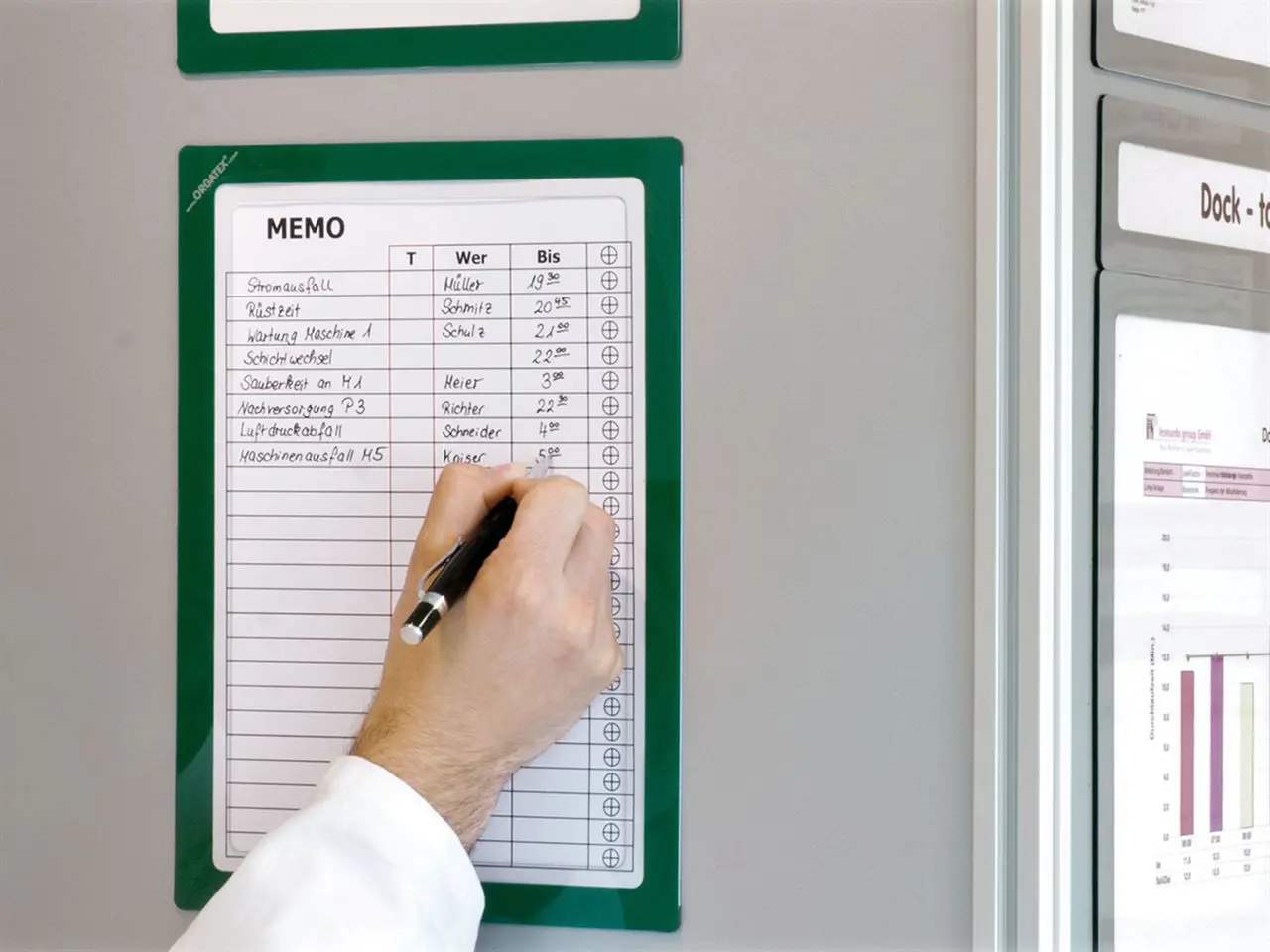 Cornice magnetica colorata con parte centrale libera che permette di esporre documenti ,programmi di lavoro o fogli di report su superfici metalliche, lavagne e macchinari lasciandoli esposti e quindi modificabili dall'operatore.