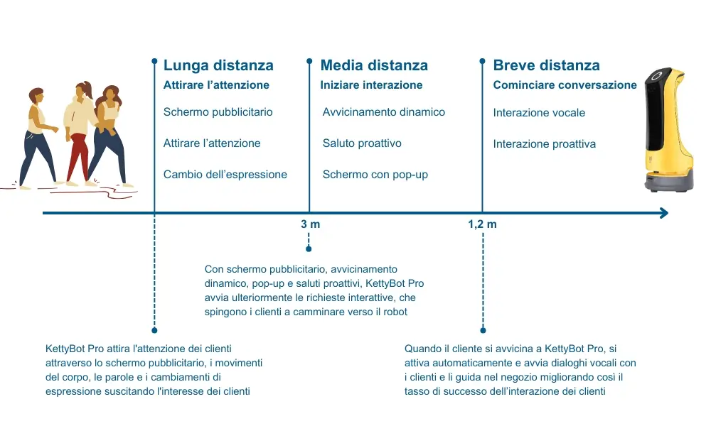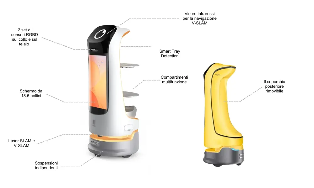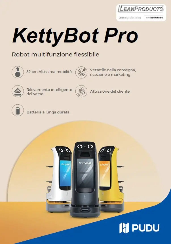 KettyBot Pro è un robot 3 in 1 per consegne, accoglienza e marketing, capace di svolgere più compiti contemporaneamente: consegnare, guidare e promuovere. Un prodotto all'avanguardia che offre un'esperienza di alto livello in diversi contesti.