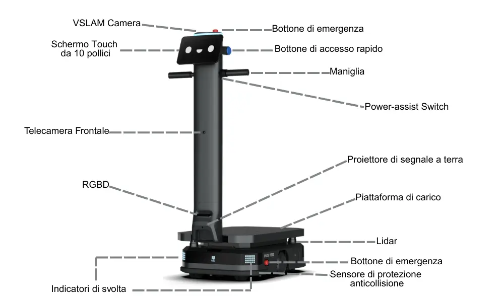 - Integrazione Smart: Compatibile con lo standard VDA5050 per dialogare facilmente con software gestionali (WMS) e altre flotte di robot.